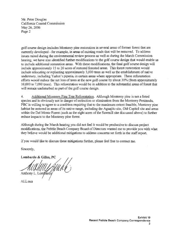 P. B. Co.'s attorney, Tony Lombardo, presents development project "alternatives" in a 3 page letter dated May 26, 2006 sent to the Coastal Commission as part of Exhibit 10 of the Staff's' June 2nd Report/Recommendation to deny approval of Measure "A" (below).