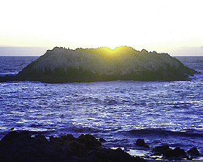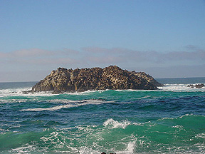 This is a midday photo of Bird Rock along the coast of Pebble Beach in Monterey County as taken from a lower vantage point along the beach. This famous landmark lies about 500 yards off the coastline. During Fall it is actually covered with California Sea Lions. During Spring it is home to nesting Cormorants. |