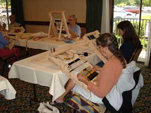 Marilyn wrote: We had a great workshop. We had a couple from the Klamath area and a few from the Bay Area.The seven women were very enthusiastic about the craft and some have expressed an interest in learning more. It was an intense three days. Mel and I made all the looms for the students; a table-top model as you can see from the pictures. The students had the option of purchasing the loom for a nominal fee and they all took them home. I hope that means that they will try to weave another piece and/or join us for further instruction. One of our students, an art therapist at the Coalinga State Mental Hospital, is trying to organize a fiber arts program there for the inmates.  We met the most interesting people!