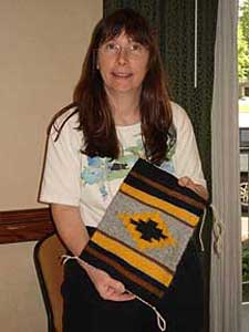 Mel wrote: Toward the end of June, I designed a special project and taught a class in Reno for the Great Basin Basket Weavers Guild. There were 14 students and it took a lot of preparation time, because they were all beginners, (Marilyn participated that day as a teacher's aide).  I made all the looms and tools necessary for them, gathered the yarn and warp, and warped-up all their looms so they could begin weaving at the outset, on that single day we had together. The project was a small fetish pouch, about four inches square. The class was very well received and many of them bought the small weaving forks I hand fashioned out of oak. They are very nice for working on small lap looms and miniature weavings. I have enclosed a couple of fetish pouch pictures I wove as various design samples. The back sides were done in stripes and wavy lines (not shown).  It was a tremendous amount of work for the teacher, but very rewarding to see the enthusiasm and appreciation of the students.
