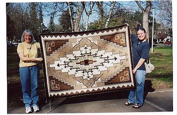 Photograph of Sarah Egan's three-year project to build a large loom and competed her 5' x 7' Two Grey Hills tapestry