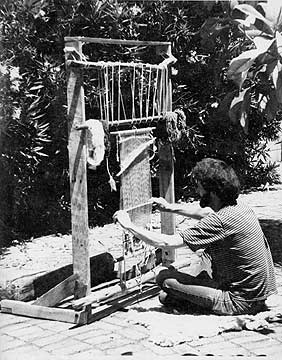 Bruce's second weaving with handspun, hand-dyed yarn, on loom and with tools made from beech, teak and charred oak planks, all driftwood found along Monterey Bay. |