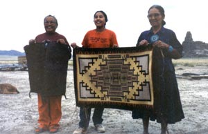 ![]() Sarah (Begay) Natani, Leona, and grandmother Mrs. Henderson holds Leona's just-finished rug with vegetal dyed yarn which became a present for Jim & Marilyn's 33rd wedding anniversary. |