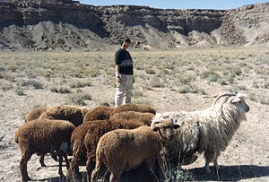![]() Mary Black observes a ram leading some lambs. (Note burlap "chastity belt" on the ram to prevent his mating until Fall to delay birthing lambs until Spring.) |