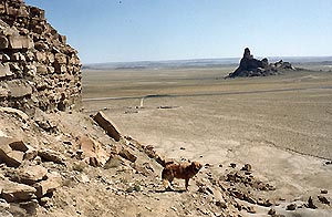 ![]() View from trail down Table Mesa. Note Natani hogan and corral nearby and Barber Rock across the road. |