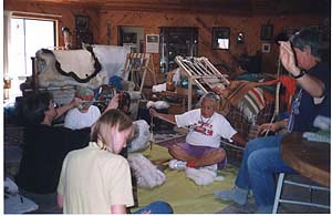 Sarah demonstrates weaving techniques to her